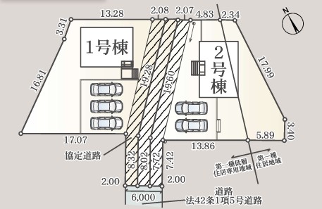 ■土地面積/1号棟:332.23㎡(100.49坪)(内、協定道路55.03㎡)2号棟:331.34㎡(100.23坪)(内、協定道路55.05㎡)